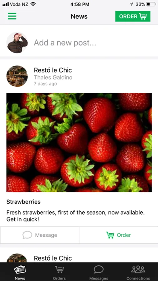HospoConnect is a mobile app that connects chefs with food and beverage suppliers and producers on a single platform. It enables suppliers to reach their chefs much more effectively and efficiently in order to promote their latest products and to communicate any other news. Chefs will have the latest product news from all their suppliers on a single screen at their finger tips and will be able to place orders from their phone.