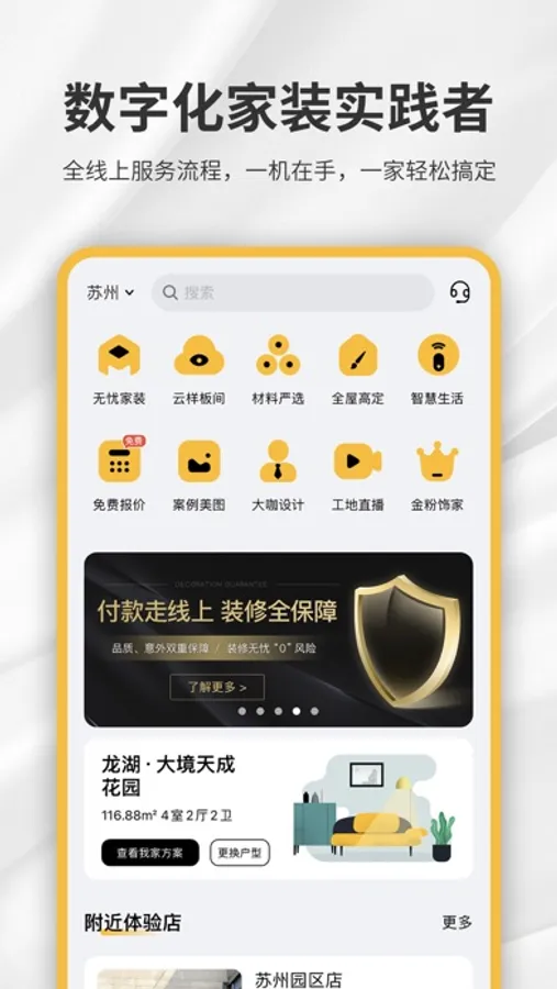 金螳螂家APP致力于优化并整合装修产业链,为客户提供一站式数字化新家装服务,同时提出“无忧家装十大保障”权益,让客户装修不再麻烦,轻松就能住新家。