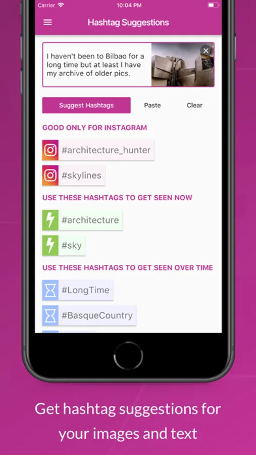 Great for Pinterest, YouTube video cover photos, Twitter image attachments and more! Select a photo from your phone to get hashtags based on the content of the image. Choose and copy the best ones to the photo caption or as a comment in the Instagram app.