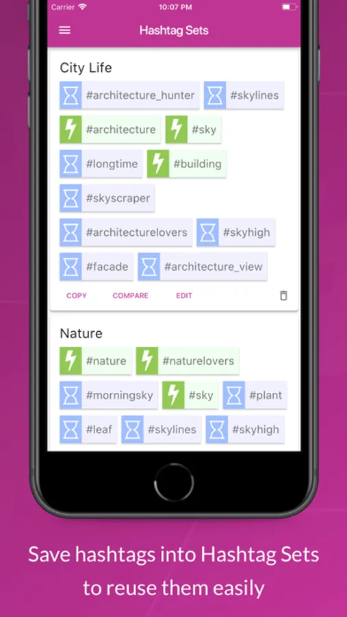Save hashtags in Hashtag Sets to reuse them again in the future.