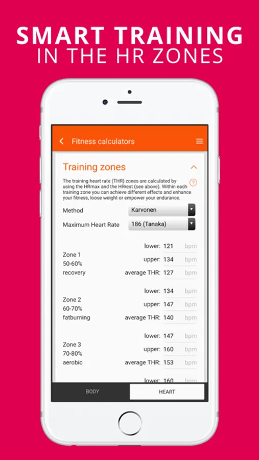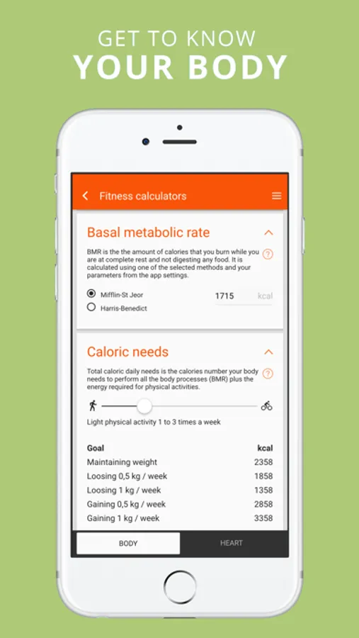 Depending on the types of activity and the user's body parameters, the app uses several formulas, methods and equations to calculate the number of calories burned during different activities. Also, the app is equipped with a number of useful calculators: body fat level, bmi, heart rate, training zones, vo2max and many more.