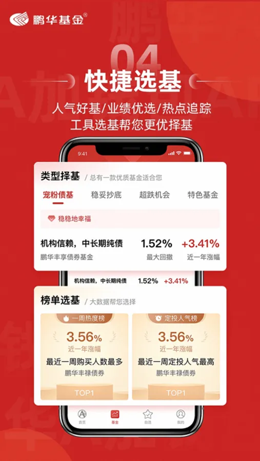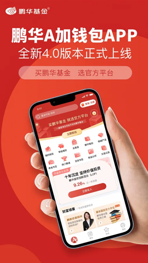鹏华A加钱包是鹏华基金唯一的官方APP。投资者可通过A加钱包对鹏华旗下公募基金产品进行交易和购买资产查询。资金在银行托管,安全有保障。