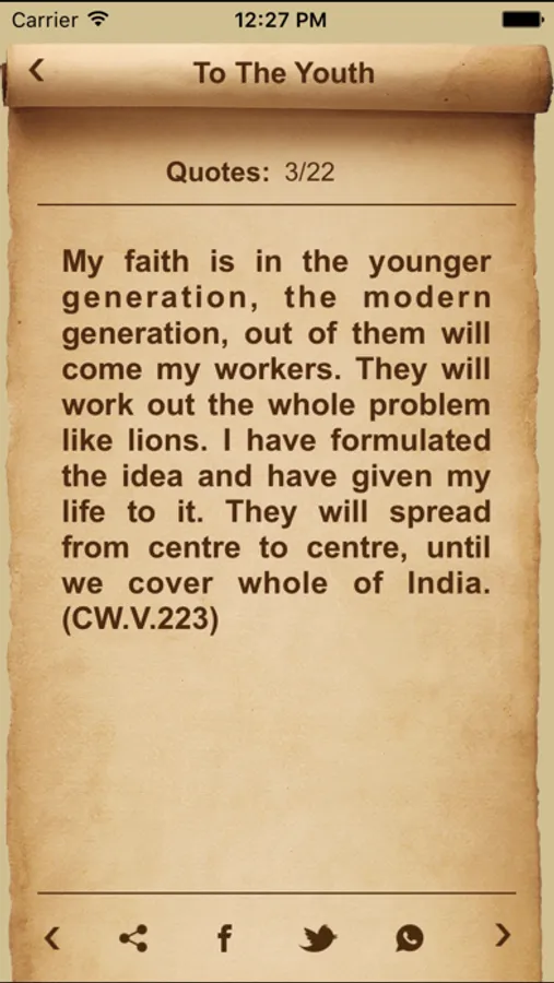 A selection of the sayings of Swami Vivekananda on various topics are available. Along with the text, an audio snippet has also been added. References to the Complete Works of Swami Vivekananda in 9 Volumes have also been included.