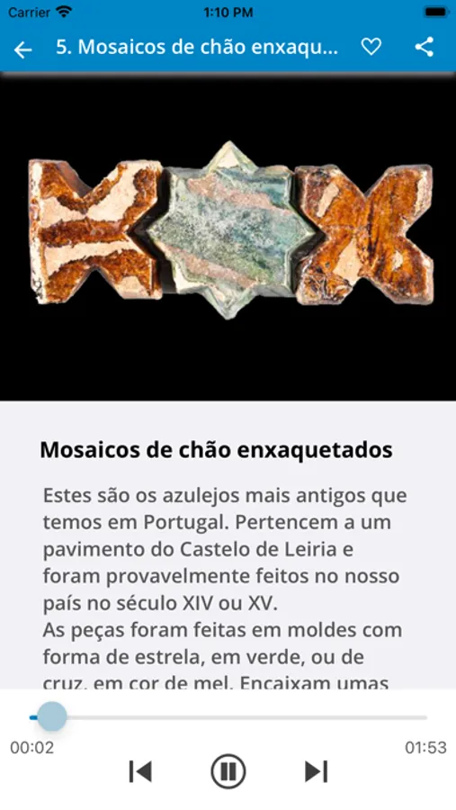 The National Azulejo Museum APP offers visitors a guided tour through thehistory of azulejo in Portugal, the most significant pieces of the exhibition and the most interesting spaces in the museum.The app includes audio version in Portuguese and English, with audio descriptions for visitors with a visual impairment. Also available vídeo version in sign language for visitors with a hearing impairment.