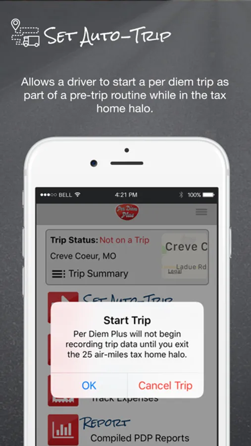 * Automatically starts tracking your trip once you exit the 25 mile tax halo in your profile (where you park your truck)