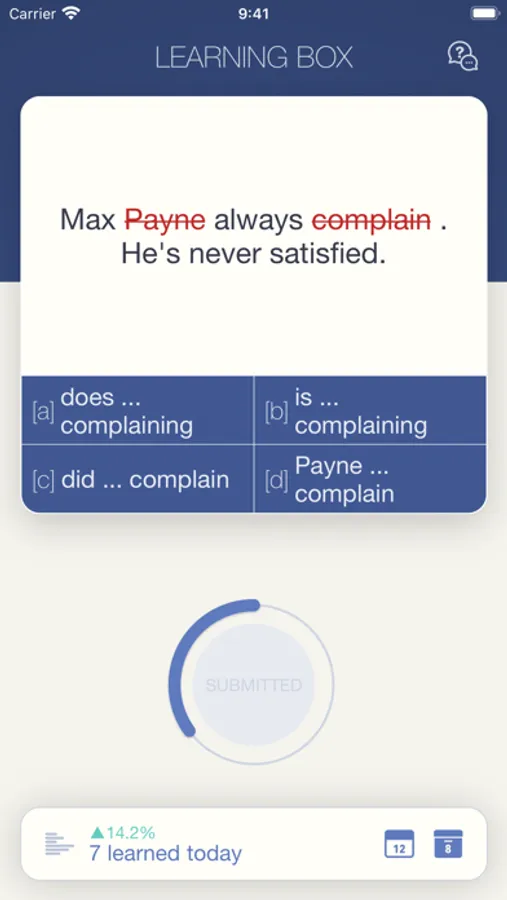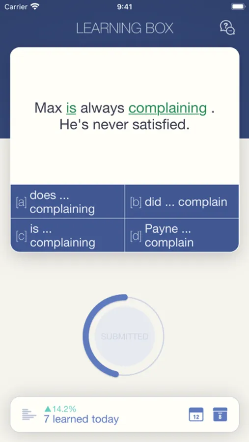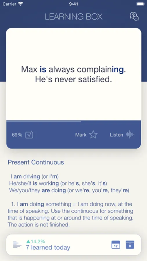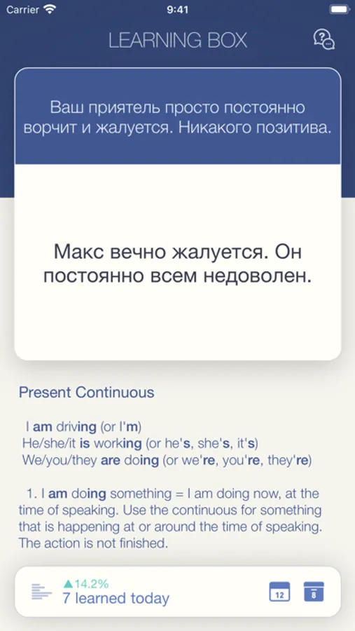 - Упражнения на закрепление на каждой карточке: огранка и шлифовка вашего навыка. Выполните упражнение правильно несколько раз подряд, чтобы завершить изучение карточки и отправить её на ожидание повторения.