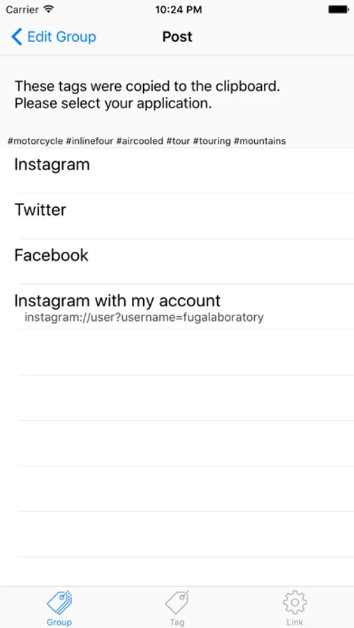 Stored hashtags and groups are copied to the clipboard with a single touch. Then, you simply paste to post content.