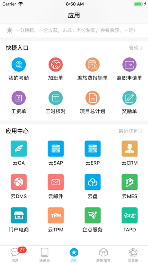 一云通,基于互联网+物联网+信息化的SaaS云平台。一云通客户端集云OA、云ERP、云盘、云邮件、云CRM等应用,让企业数据真正通起来。打通内部经营管理的协作;打通业务交互的信息孤岛;打通合作伙伴的业务协作。一云通,您身边的企业信息化管理专家!
