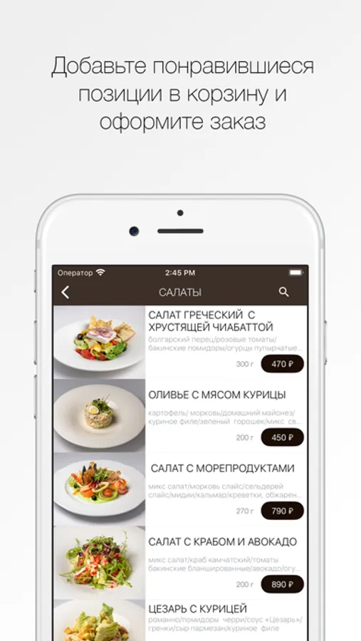 Как сделать заказ в приложении “Cafe De Marco”: выберите понравившиеся позиции из меню, добавьте их в корзину и перейдите на экран оформления заказа (по нажатию на иконку корзины).