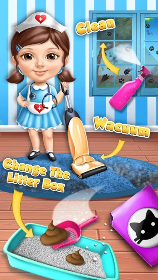 · Clean up with pet vet Chloe - wipe, sweep, polish, vacuum, change the litter box and throw away the trash!
