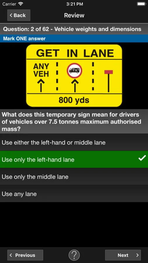 Perform a simulation under the same conditions as the DVSA theory test. When you finish the test you will see your score and review all the questions. View full explanations after each question to help you remember the correct answer for next time.