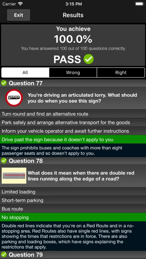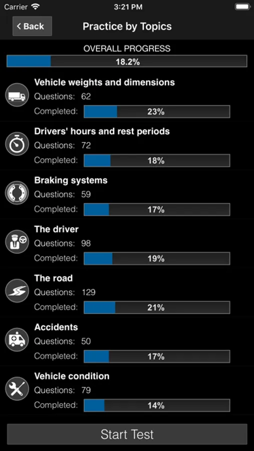 Test your knowledge by practicing by categories.You can select one or more categories to practice. You can also perform rapid tests for 10, 20 or 30 questions. In this section there is no time limit and you can see the explanation of the DVSA before selecting the correct answer.