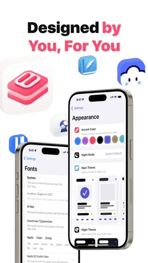 Your Journals, Your World: Create multiple journals, each reflecting your mood, dreams, or memories. Personalize every page — choose icons, design styles, and fonts that perfectly match your vibe.