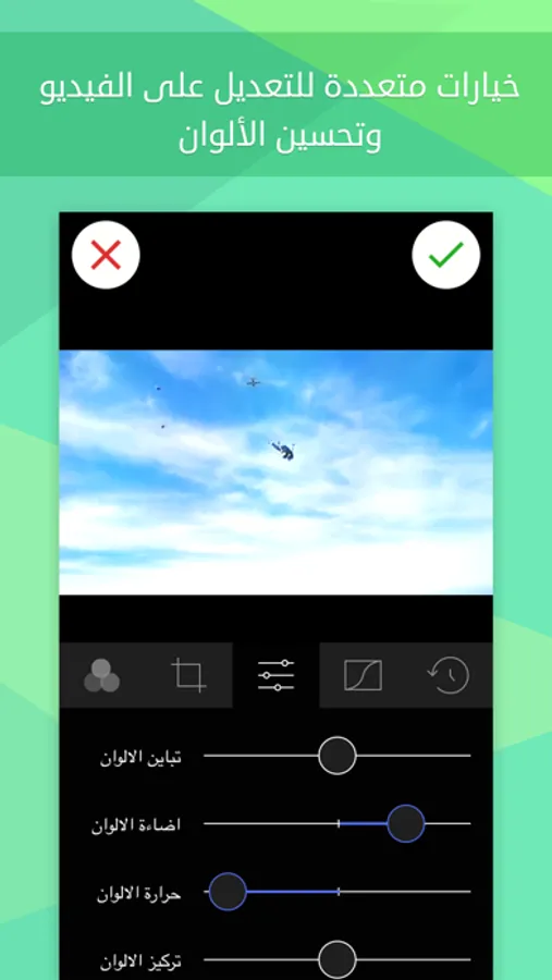 - تغيير الاضاءة و تركيز الالوان و حدة او قوة اللون و كذلك اضافة اطار من الظل حول الفيديو