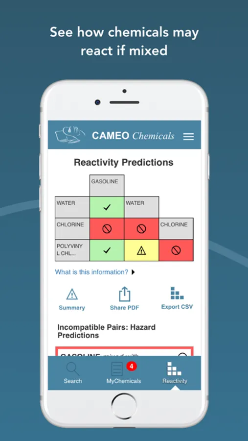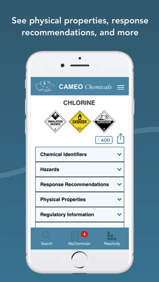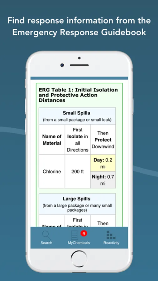 * Get offline access: the app runs without an internet connection. You can search for chemical and UN/NA datasheets, view ERG Response Guide PDFs and U.S. Coast Guard CHRIS PDFs, create MyChemicals collections, and view reactivity predictions--all while you're offline. When you're online, you can also go to additional resources on external websites (such as the NIOSH Pocket Guides and the International Chemical Safety Cards) from the app.