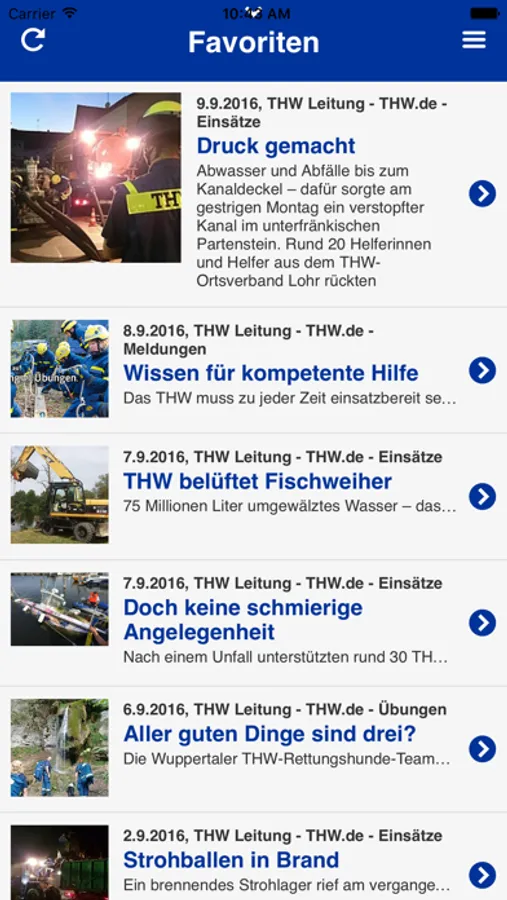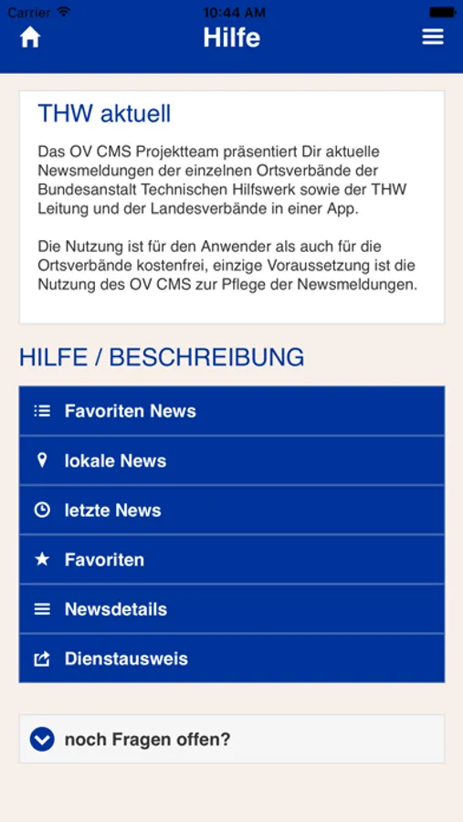 Du wählst aus, ob du die Nachrichten deiner Favoriten, die letzten Meldungen oder auch die letzten Meldungen zu deinem aktuellen Standort erhalten willst. Neben den vollständigen Nachrichten umfangreichen Bildmaterialien, dem Verweis zu den einzelnen THW Ortsverband Webauftritten, Kartenübersichten zur Lokalisierung einzelner Meldungen werden wir vom OV CMS Projektteam diese App in den nächsten Monaten mit weiteren Funktionen ausbauen.
