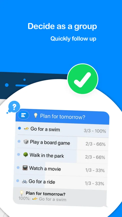 Need to decide as a group? Choose a time? Pick a place? Send a poll to a group of friends and get their votes. Participants in the conversation can answer the questions in the survey, and everyone can easily follow-up on the results.
