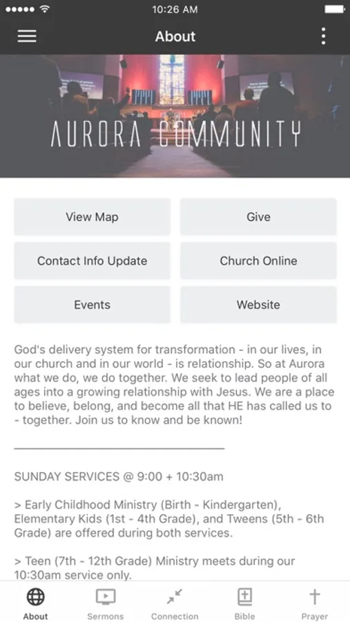 The Aurora Community Church App was created with the Subsplash App Platform.