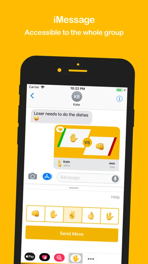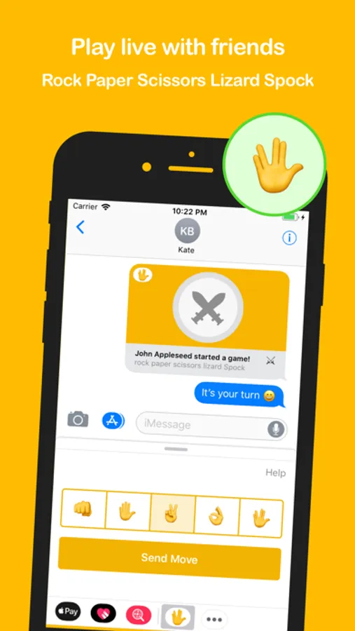 Play the classic game Rock Paper Scissors and add 2 extra options: Lizard and Spock. Challenge friends and family. With this multiplayer app you can play live. No accounts needed. It's super easy, and integrates nicely in your iMessage conversations. Download the app now and start challenging your friends!