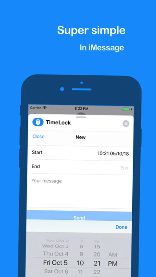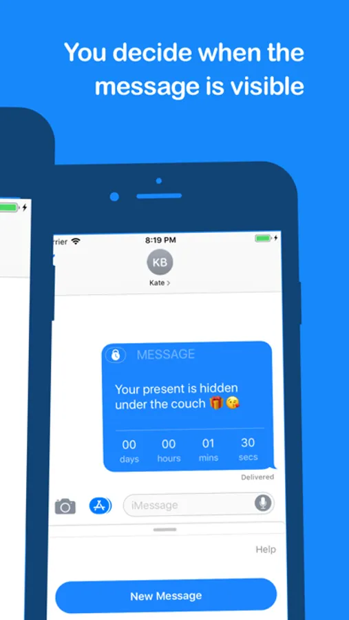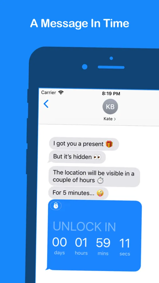 Thank you for your support. Over a million time locks have been created! -- With time lock, you decide when your message will be visible an for how long. It's a cool new way to spice up your conversations and make your friends curious about the message. Share secrets in a group and only make them visible for a couple of seconds. Or share details on where to meet and make it more exclusive. It's really fun, try it out.