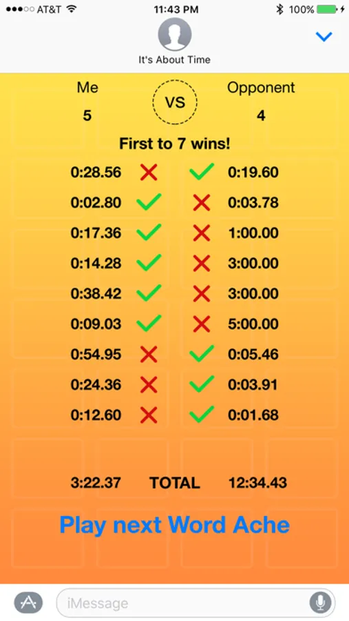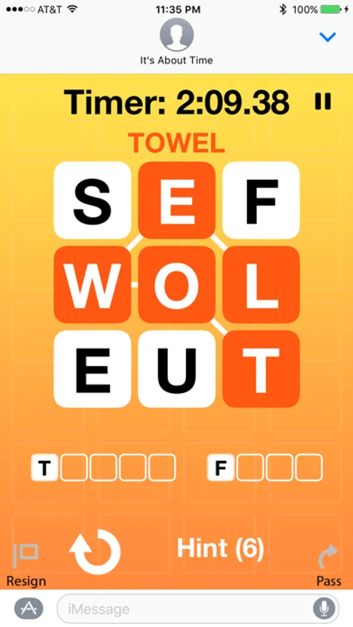 Word Ache is like WordBrain but with one awesome twist... The game is built into iMessage! Play with any of your friends, chat with them, and do your best to win! You want to solve the puzzle faster than your opponent. If you do, you get a point. First person to 7 points wins! What's your strategy? Grids start at 2x2, then go to 3x3 and 4x4 with incremental difficulties in the puzzle. Do you save your hints for more difficult rounds or use them early to get quick points? Good luck!!!