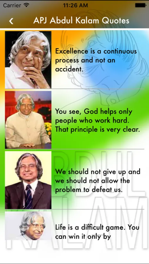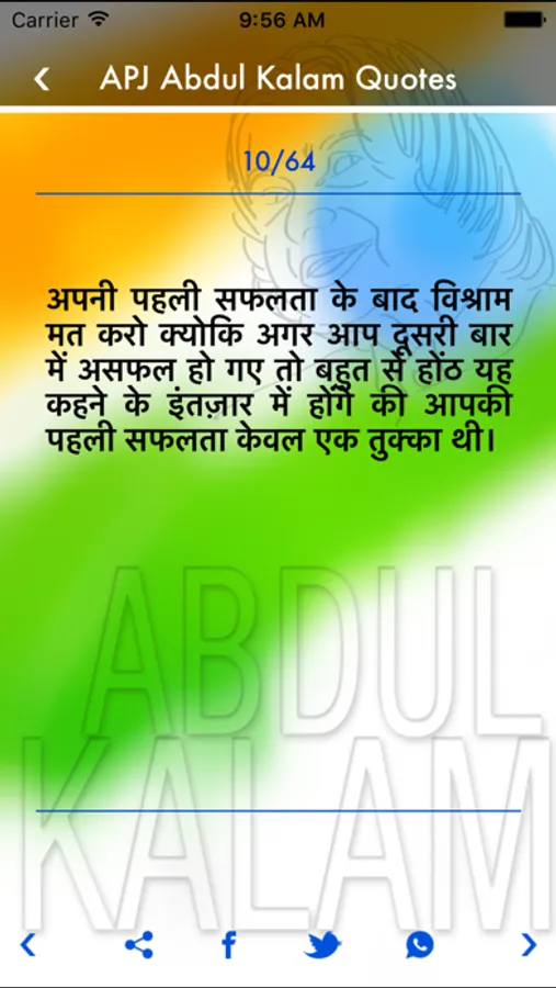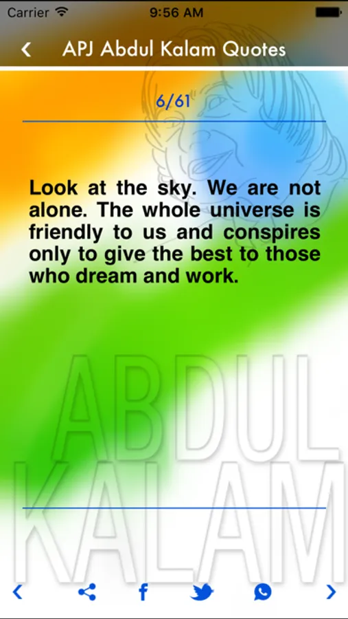 This App is a collection of APJ Abdul Kalam quotes. All that you need to express or send that you feel about the quotes. You get it here. This application is easy to handle and a quikie too. You just select the quote, tap on it and you will get the options to send it. Select that you want and here you go.