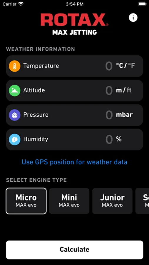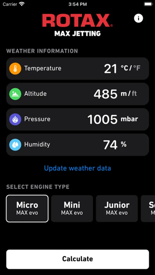 The Rotax MAX Jetting App enables the user to calculate the optimal carburetor main jet size for Rotax kart engines of the MAX series: