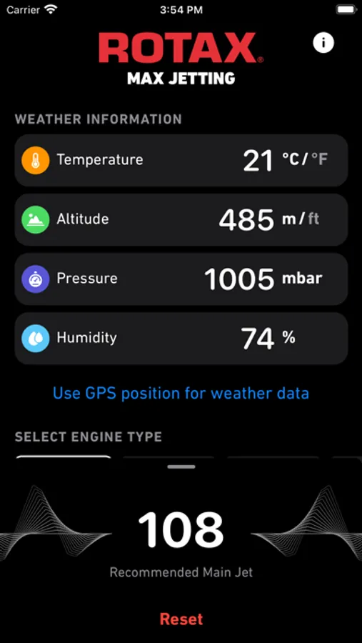 Click on Use GPS position for weather data, select the desired engine type from the scroll menu and start the calculation tabbing the Calculate button.