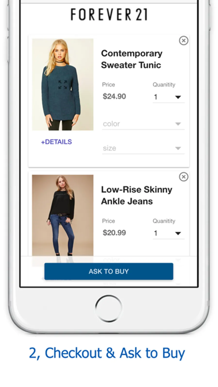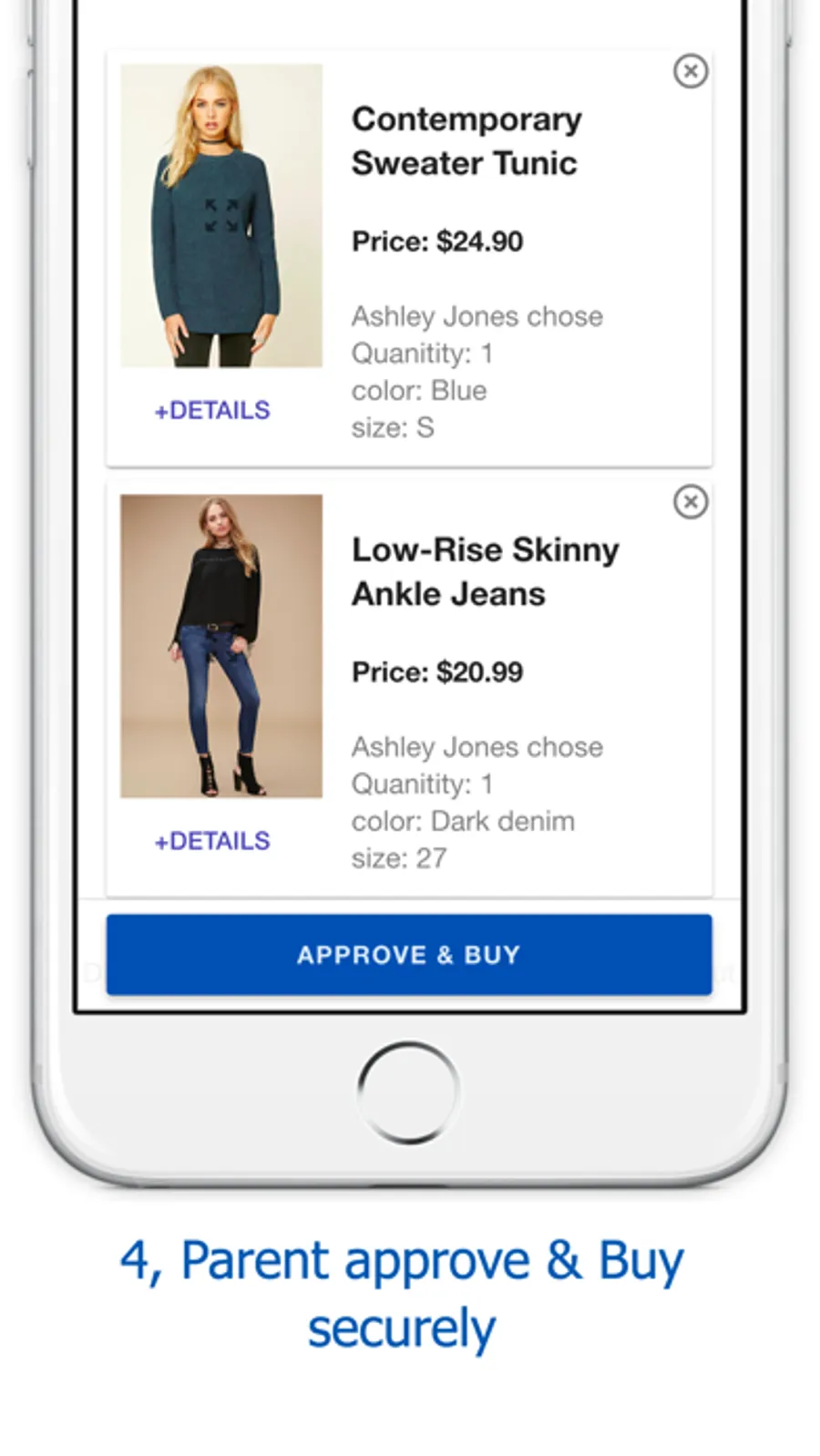 Teens add products from store website to Pushkart. They then checkout and send their cart to parents. Parents can then approve and pay for the purchase.
