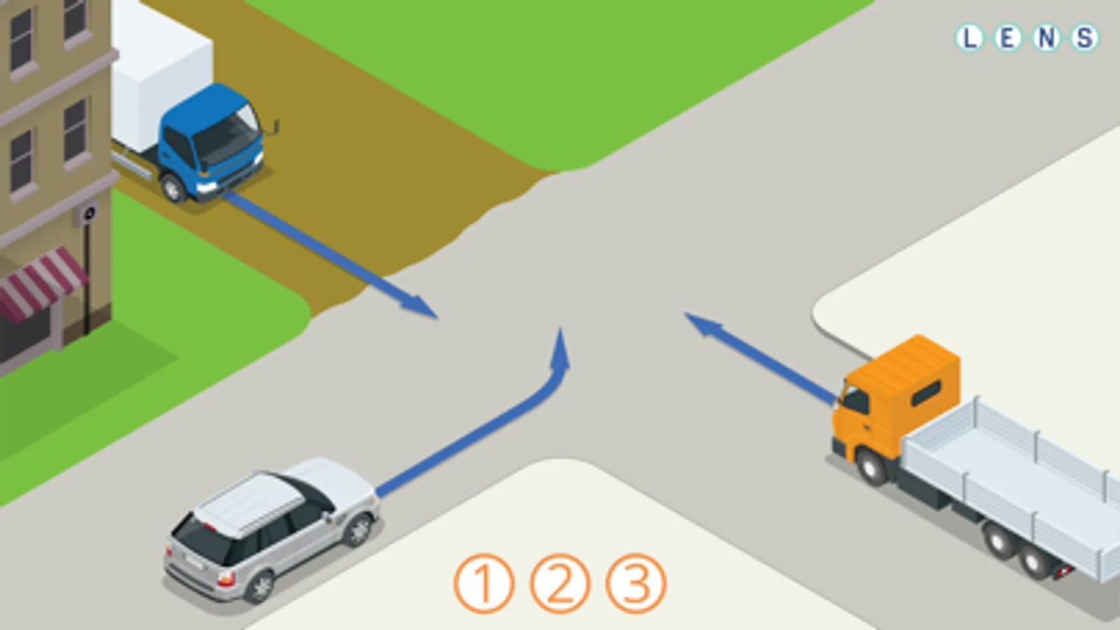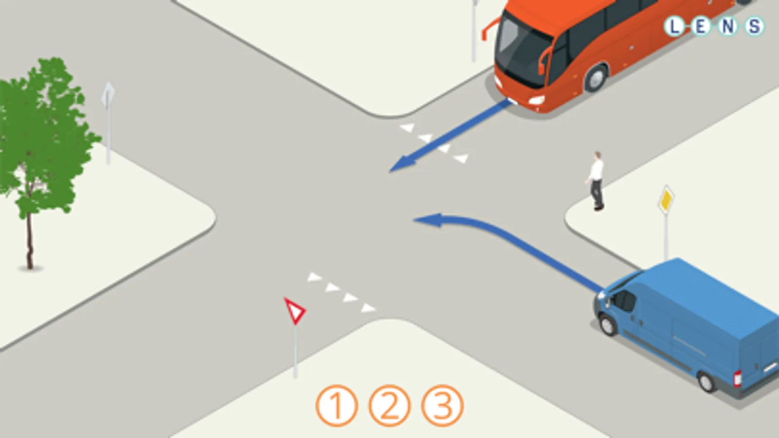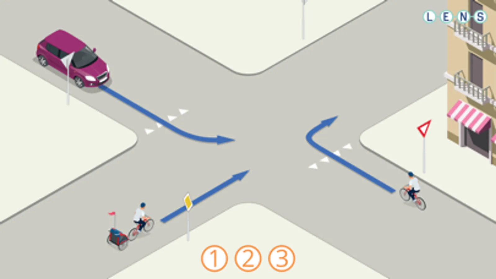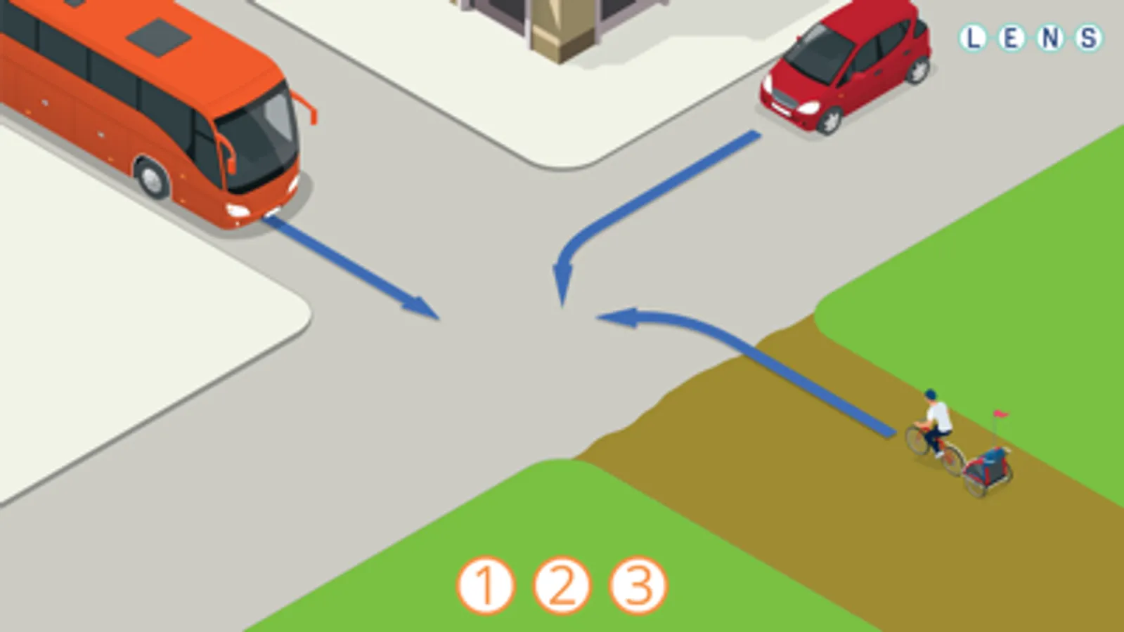 Onderaan in het scherm staan een aantal cirkels met een cijfer. De bedoeling is dat je de cirkel met het cijfer 1 op de verkeersdeelnemer sleept die het eerste mag en het volgende cijfer op de de deelnemer die daarna mag. Als je alle cirkels op de plek hebt gesleept krijg je te zien of je het goed had of niet.