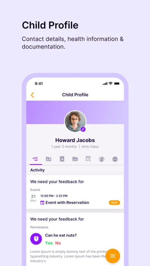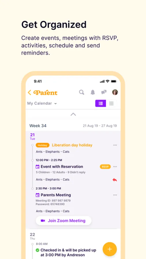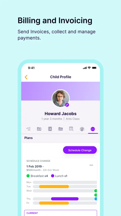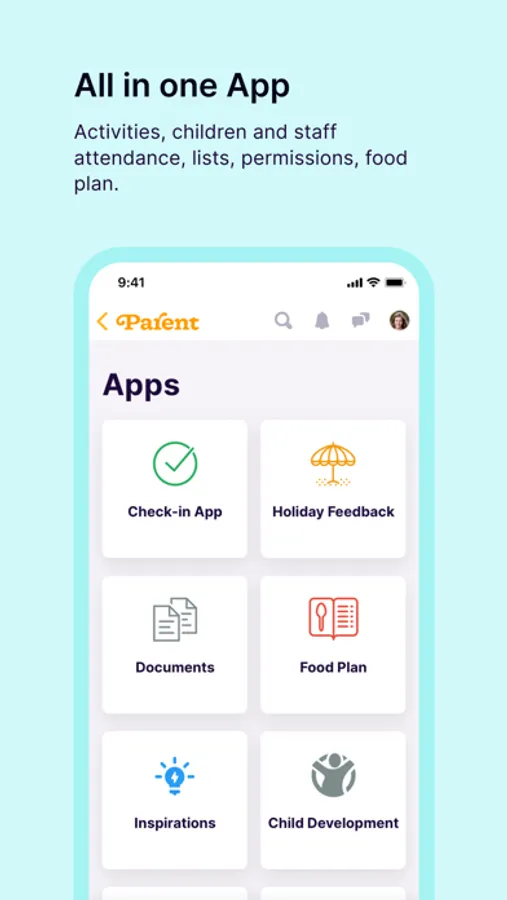 Parent is a comprehensive solution with many evolving features. This includes attendance tracking, events with automatic reminders, daily reports, detailed child profiling, child development, photo and video sharing, unlimited document storage, billing, e-learning and much more.