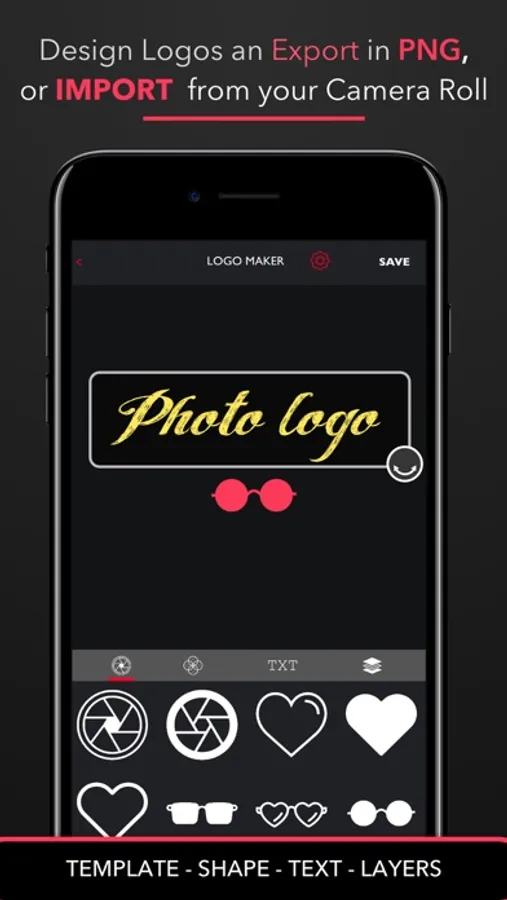 You can design logos with : artwork, shape, text and custom elements, in a simple way or import your mark directly, also in png, from your camera roll.