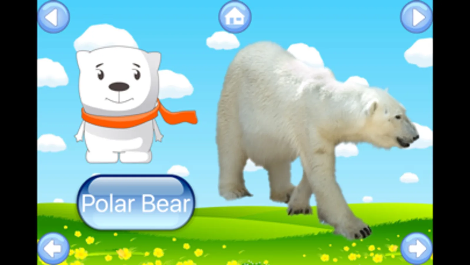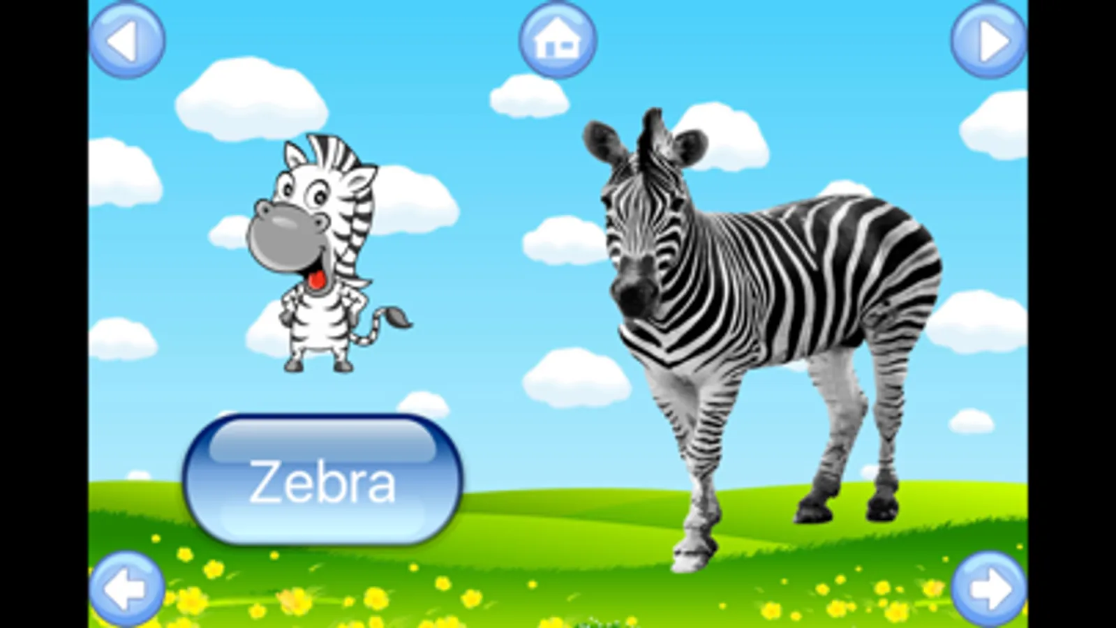 Our animal sounds game can be used even by babies. Child can tap a next button to see the next picture, use a big buttons to repeat animal English names and use a real photo to repeat animal sounds.