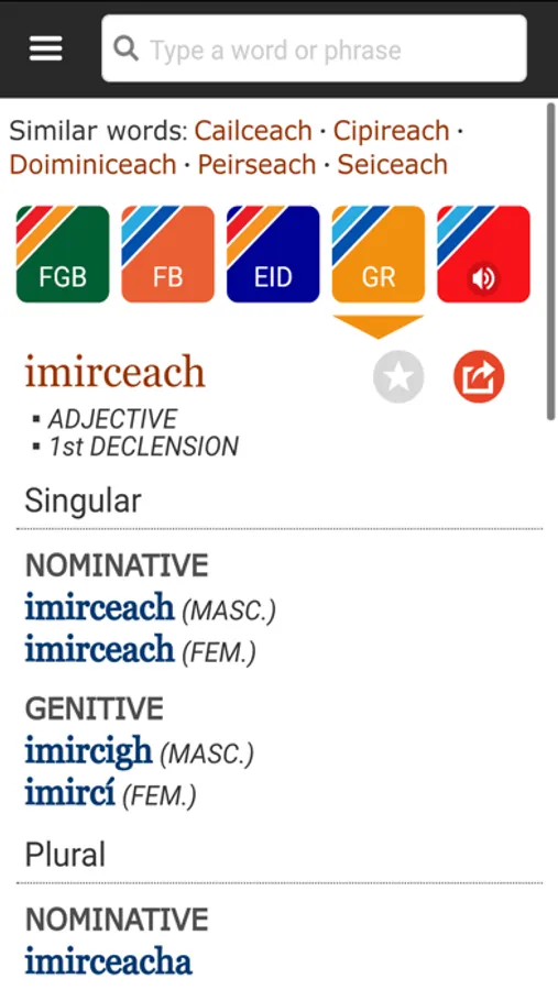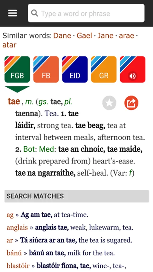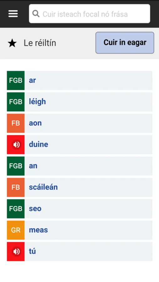 • Uathchríochnú sa chuardach chun cabhrú leat focail agus frásaí a aimsiú go tapa;