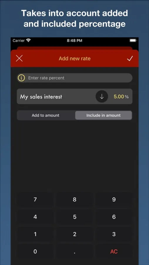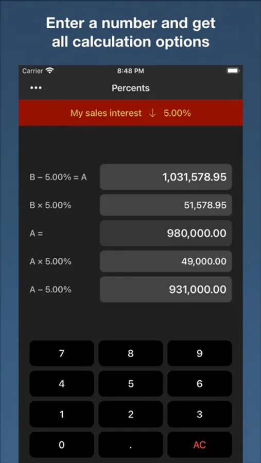 Just enter a number and immediately get both the added amount and the amount taking into account this amount, as well as the amount of the reverse interest.