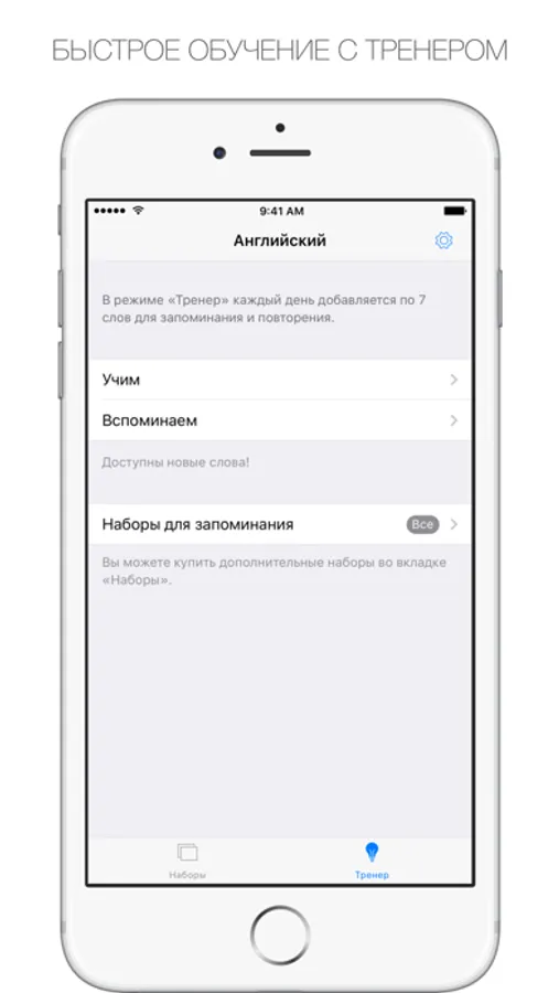 Уникальный режим «Тренер» основан на научных работах и огромном опыте ведущих профессионалов в области обучения иностранным языкам и позволяет быстро и легко изучать незнакомую лексику при регулярных занятиях.