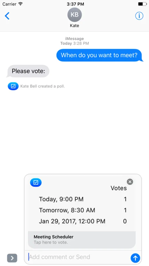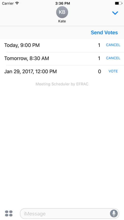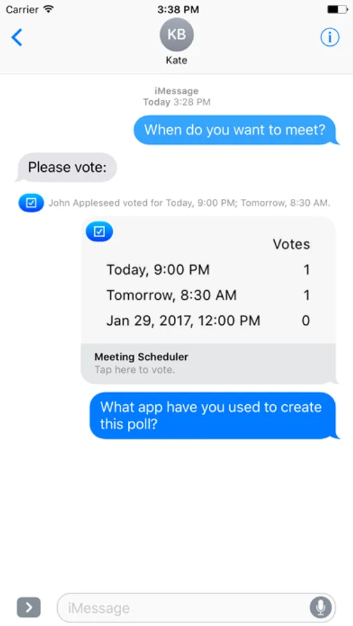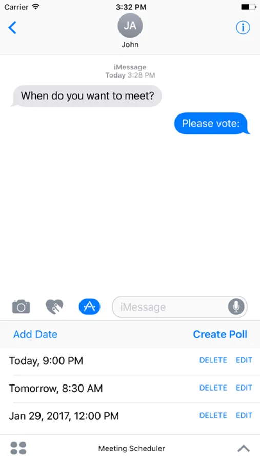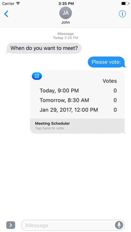 Meeting Scheduler is an iMessage app that allows you to create a list of dates and times. Your friends can then vote on these dates and you can schedule a meeting. It is very simple and very useful.