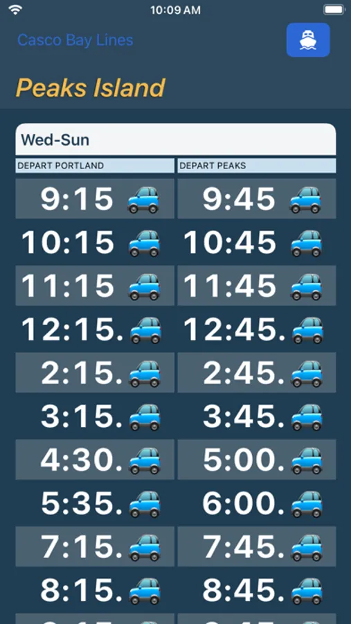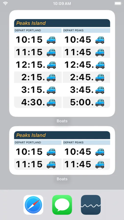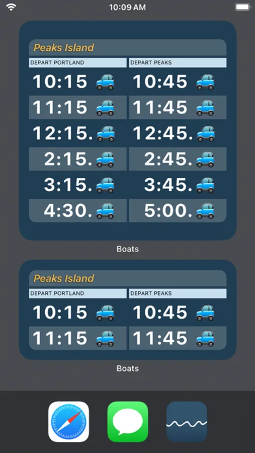 Boats packs the complete Casco Bay Lines ferry schedule for Peaks Island, Little Diamond Island, Great Diamond Island, Diamond Cove, Long Island, Chebeague Island and Cliff Island into every possible widget and complication.