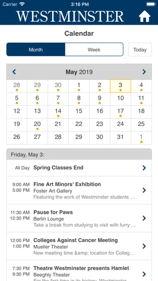 With the WestminsterPa app, students can view announcements, weather, social media, participate in your Campus Group, view maps of the campus and search the campus directory.