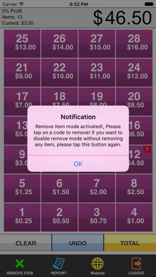 Now it’s time to help the students shop! Make sure your volunteers understand that each item has a "price code" that corresponds to the cost of the item. They simply press the price code of the items the child is purchasing. The total cost of the sale will be displayed as they are inputting the items, so your volunteer will immediately know if the student is spending over their budget! Should they make an error they simply tap "undo' and it will undo the last entry, should you need to start over, simply tap "clear" If you need to go back and remove a specific code at the end of calculation just tap the "remove item" button then tap the code you want to delete from the sale. That code will be deleted and you can proceed with check out.