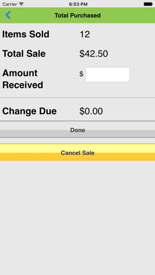 When the student is done shopping tap the "Total" tab and you will be brought to a Total Purchased Screen. You will see the total number of items that the student purchased, and the total amount of the sale. Enter the amount of money you received in the "Amount Received" box and this awesome App figures out the change due…how easy is that! Press "Done" and it takes you back for the next shopper.