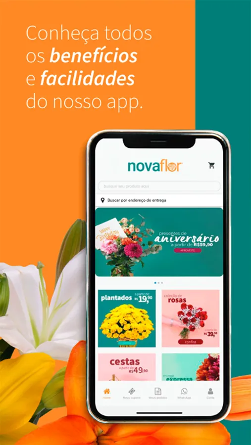 Seja bem-vinda (o) ao app da Floricultura online Nova Flor! Na Nova Flor você tem a mais completa Lojas de Flores e Presentes do Brasil para comprar Flores com os Melhores Preços da Internet, Presentes, Buquê para noivas e muito mais. No aplicativo da Nova Flor você também vai poder personalizar seu presente e surpreender quem você ama.