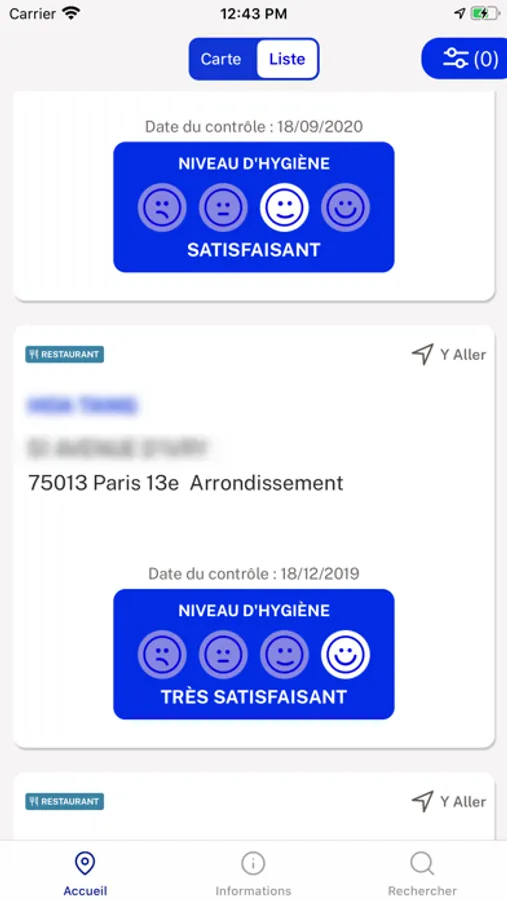 Avec l’application Alim’confiance, vous pouvez consulter le niveau d’hygiène des commerces autour de vous (restaurants, métiers de bouche, distributeurs) à l’aide d’une carte interactive. Les résultats des établissements agroalimentaires sont accessibles via la fenêtre de recherche par la saisie du nom de l’établissement ou de son numéro d’agrément sanitaire présents sur l’étiquette des produits alimentaires.