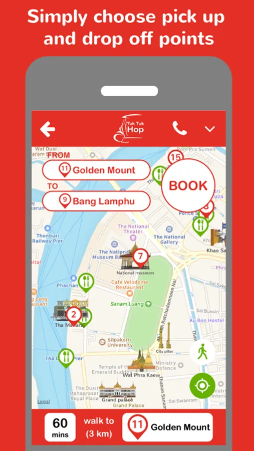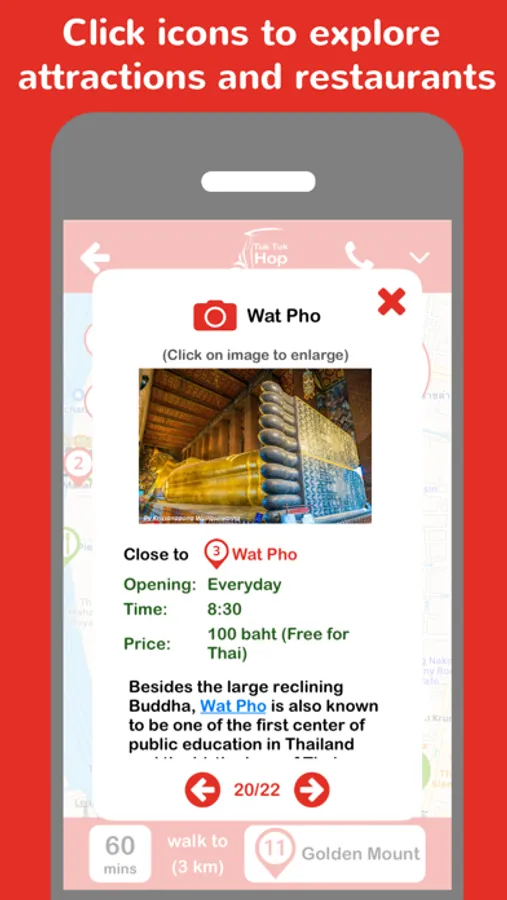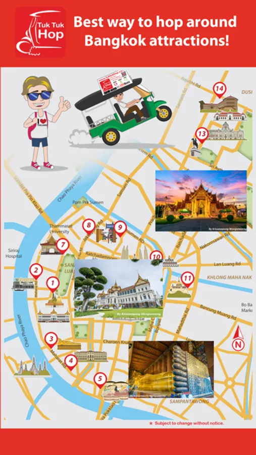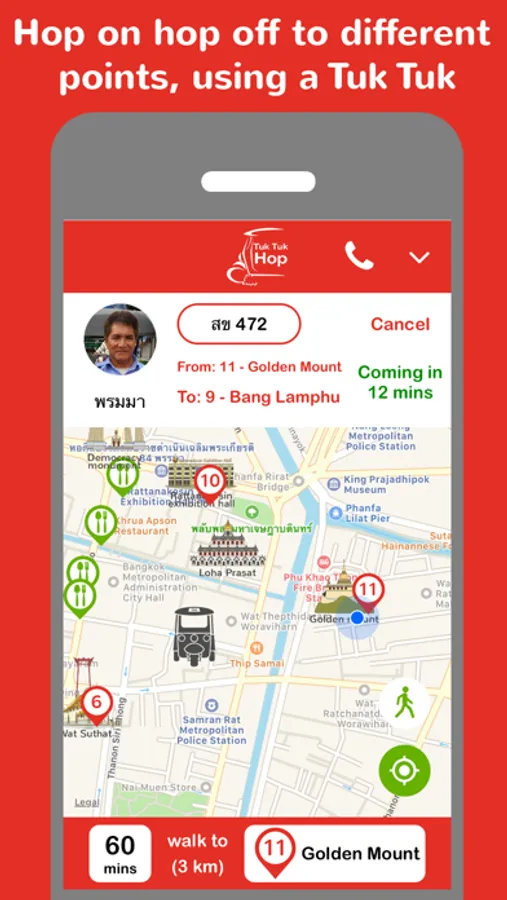 Welcome to Thailand! This app will let you hop on hop off around Bangkok main attractions in a tuk tuk. Pay once and you can hop to different places all day. The tuk tuk service is on demand so you can relax and enjoy each place at your own pace. It is safe, easy, and fun. No more haggling or worrying about scam. Even if you don’t use our service, you can still use our app to get useful information about attractions in Rattanakosin area.