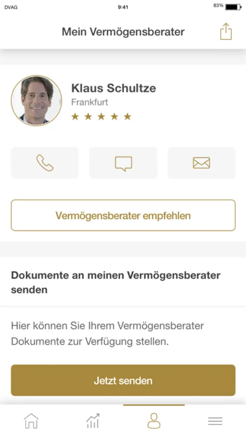 Kontaktieren Sie Ihren Vermögensberater per Telefon, E-Mail oder SMS direkt aus MeineApp heraus. Vereinbaren Sie einen Termin und rufen Sie die Kontaktdaten und Öffnungszeiten Ihres Vermögensberaters auf. Die interaktive Karte mit Routenplaner zeigt Ihnen den schnellsten Weg zum Büro Ihres Vermögensberaters.
