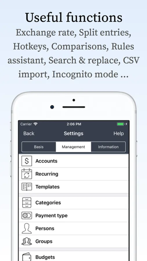 • Create budgets in order to control expenses (including automatic allocation of transactions)