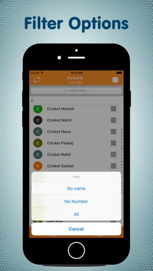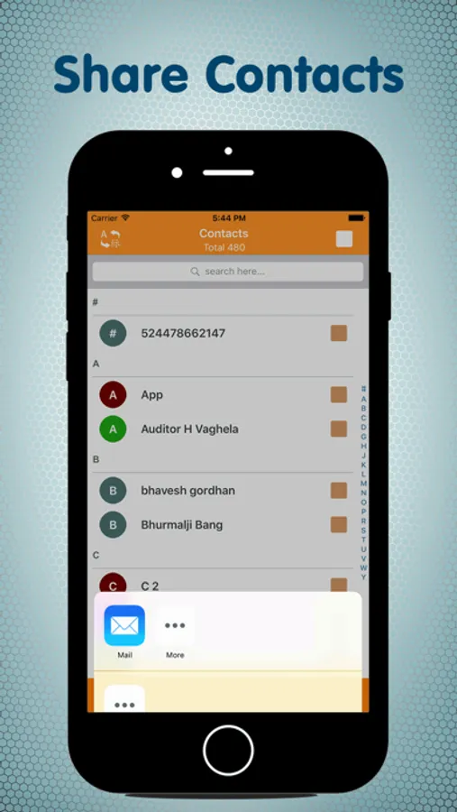 4. Option to export contacts, all or selected and then share contacts or save to your mail account.