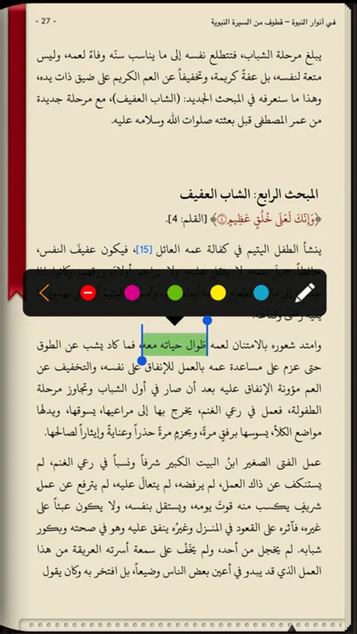 -إمكانية تظليل جزء من نص الكتاب بألوان مختلفة، مع إمكانية إضافة الملاحظات.