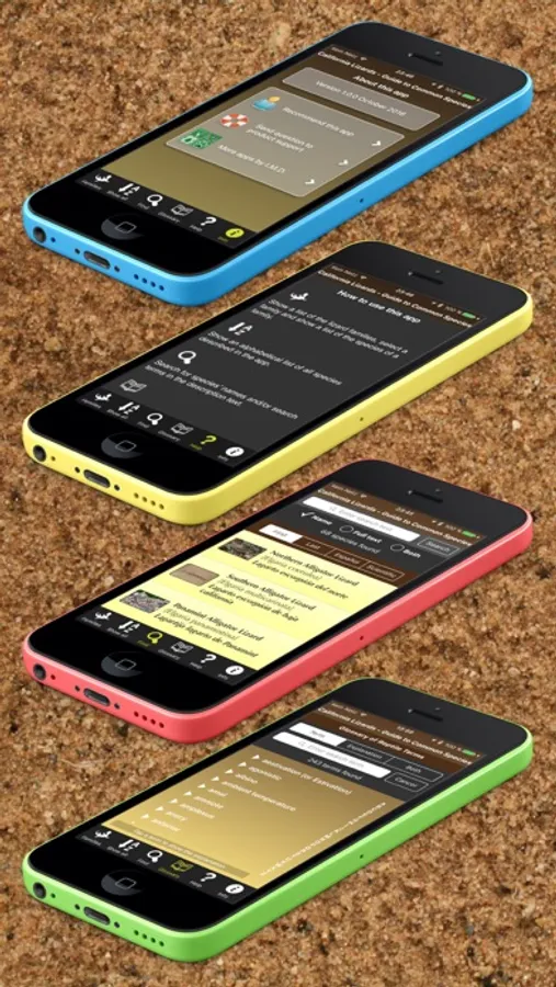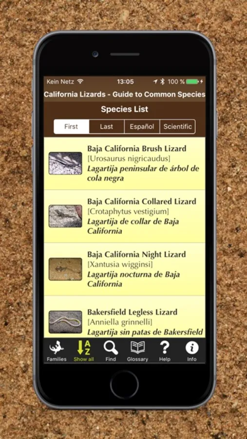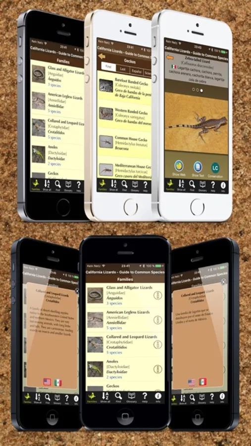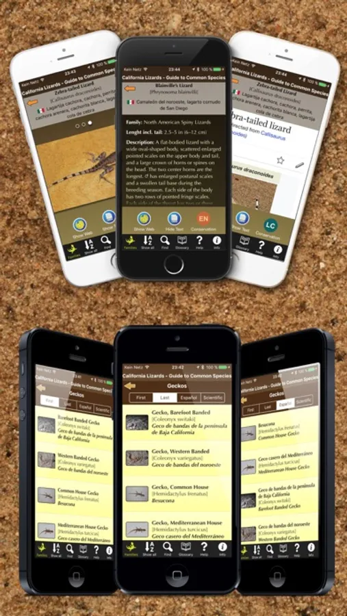 This app shows 60 lizard species found in California. For each animal there are two or more high-resolution pictures, a brief description, and a link to view the corresponding Wikipedia pages within the application window. All descriptive information is in English, the animal names are also shown in scientific (Latin) denomination and most of them in Spanish.
