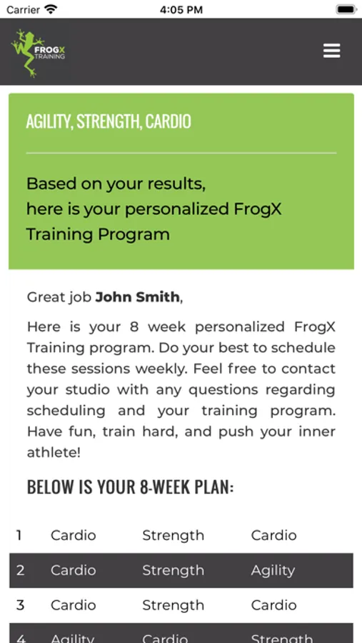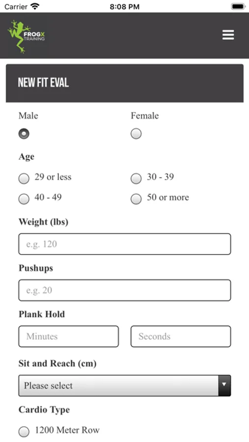 The FrogX Training app is a quick and easy way for ETF Fitness members to record Fit Test results and receive an 8 week personalized training plan immediately. Users can also view previous Fit Test results and update studio location as needed.